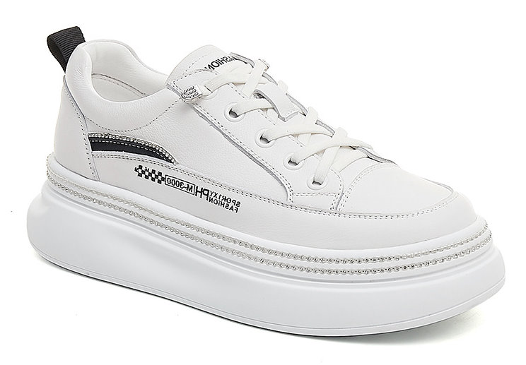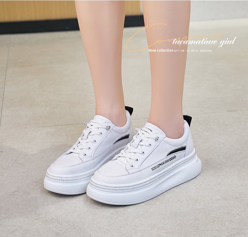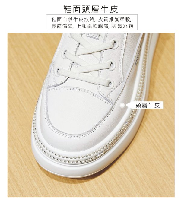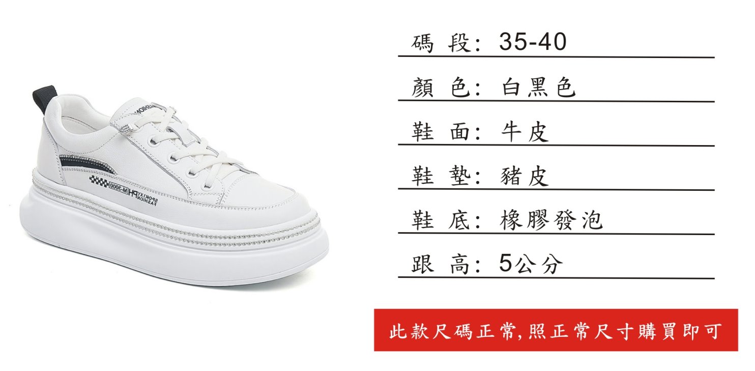 【Annalee】增高鞋底水鑽延條真皮小白鞋 - 白黑 053675